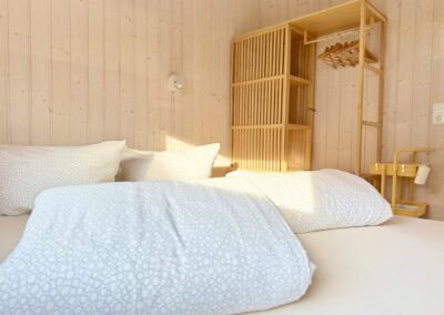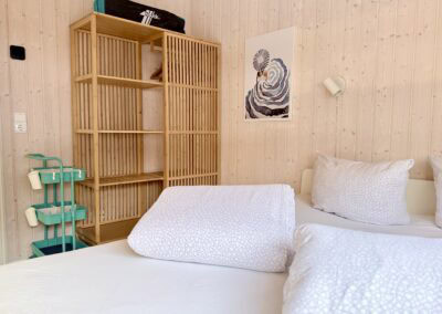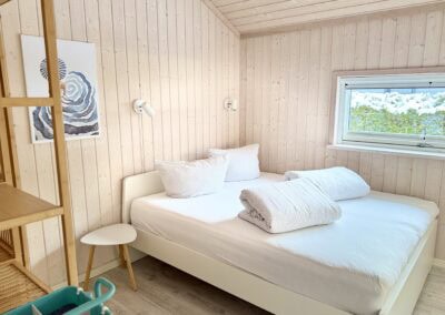 Das Ferienhaus See Huus verfügt über ein Schlafzimmer mit Doppelbett (160 cm) sowie ein weiteres Schlafzimmer mit Doppelbett (180 cm) und TV. Zusätzlich steht im Wohnbereich ein gemütlicher Alkoven (140 cm) zur Verfügung. Verdunklungsmöglichkeiten und Fliegengitter sorgen in allen Schlafbereichen für erholsame Nächte.