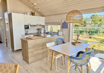 Große Fenster lassen viel Licht herein und öffnen den Blick ins Grüne. Die offene, sehr gut ausgestattete Küche lädt zum gemeinsamen Kochen ein, der Wohnbereich bietet Raum für entspannte Abende mit Familie oder Freunden.